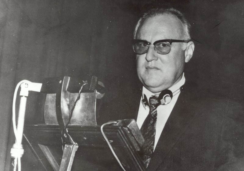 Földházi Sándor (1926-2000) állatorvosi oklevelét 1951-ben szerezte. Határállomás-vezető főállatorvos Békéscsabán. A Magyar Agrártudományi Egyetem Állatorvostudományi Karán óraadó tanárként működött. Személyes és más dokumentumait a Levéltár "102. Földházi Sándor iratai" fondja őrzi. A felvételen 1976-ban, Zimmermann Ágoston születésének 100. évfordulóján a Magyar Tudományos Akadémián tart előadást.