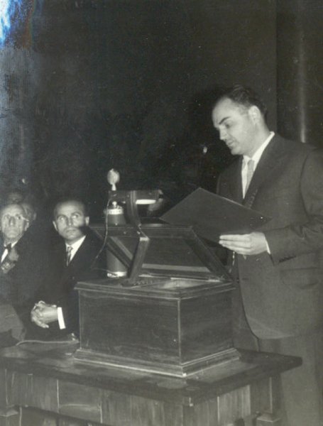 S. Forenbacher professzor a zágrábi Állatorvosi Fakultás dékánja beszédet mond a Magyar Tudományos Akadémián rendezett jubileumi ünnepségen.
