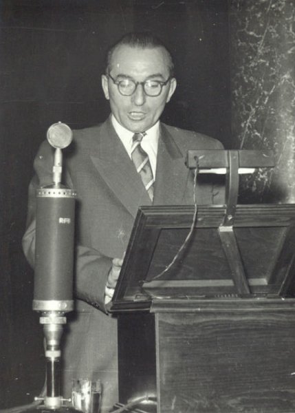I. Grigorescu professzor a bukaresti Állatorvosi Fakultás dékánja beszédet mond a Magyar Tudományos Akadémián rendezett jubileumi ünnepségen.
