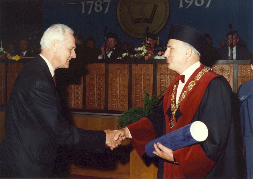 | Horn Artúr akadémikus átveszi a h. c. doktori oklevelet Kovács Ferenc rektortól.