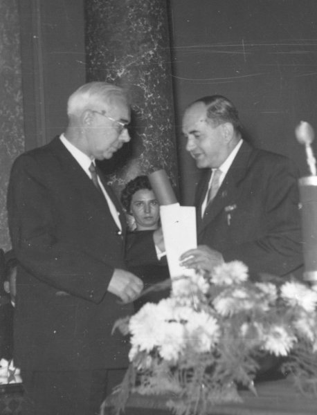 Manninger Rezső átveszi a h. c. doktori oklevelet | KÉSZÜLT: 1962. szeptember 16. FÉNYKÉPÉSZ: A 175. évforduló fényképészei MÉRET: 11,5 x 8,2 cm FORRÁS: ÁOTK Levéltár 15. fond, Zöld Album, 121. kép |