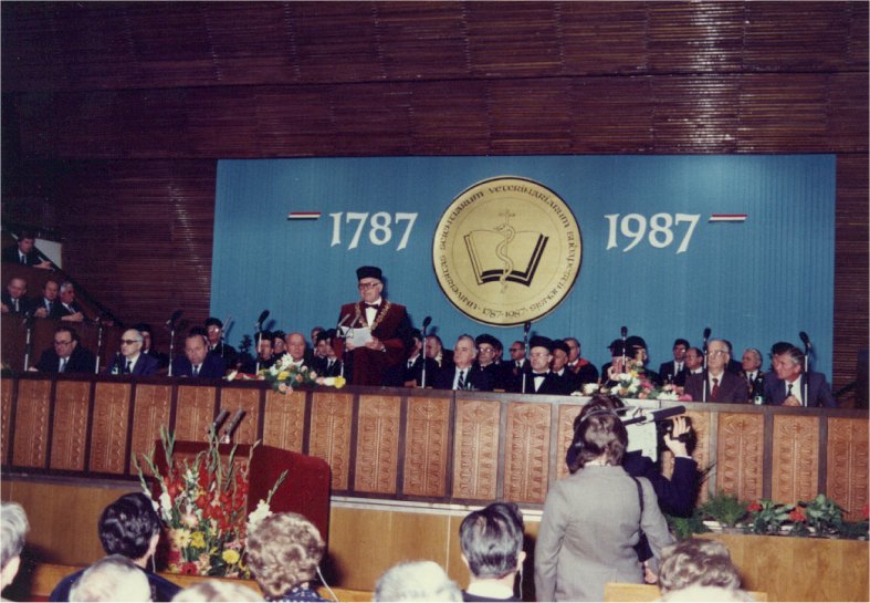 Kovács Ferenc rektor megnyitja az ünnepi tanácsülést. A első sorban az elnökség tagjai: Medve László, Köpeczi Béla, Váncsa Jenő, Losonczi Pál, Pál Lénárd, Simon Ferenc (elnök), Juan F. Figueroa, Straub F. Brunó, Iványi Pál. Háttérben az egyetemi tanács.
