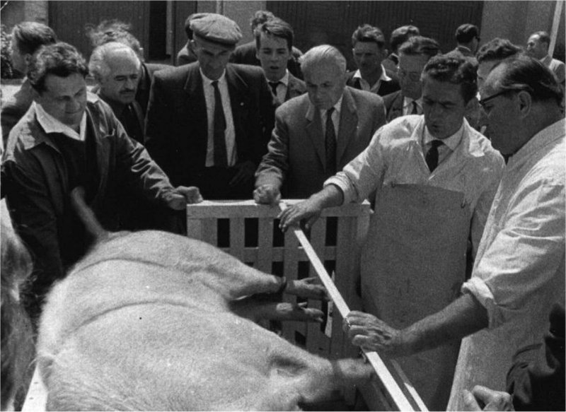 Kómár Gyula (jobbra) egy sertést szemlél Cegléden